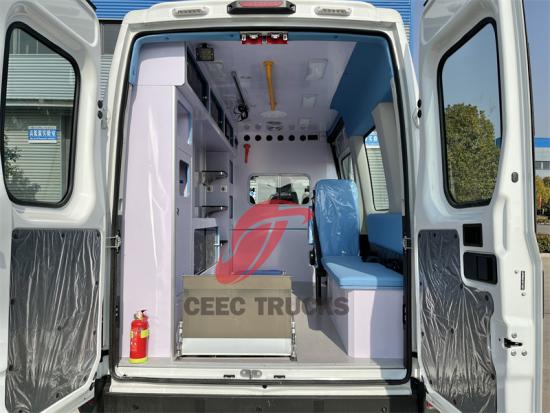 2. Peralatan perubatan lanjutan dan reka bentuk berperikemanusiaan:Bahagian dalam kabin perubatan dilengkapi dengan peralatan pertolongan cemas yang komprehensif dan canggih. Sistem pengusung muatan automatik bukan sahaja memudahkan pemindahan pesakit, tetapi juga mengurangkan beban fizikal kakitangan perubatan. Sistem penghawa dingin dan pemanasan yang dikawal secara bebas menyediakan persekitaran yang selesa untuk pesakit dan kakitangan perubatan, manakala lampu pembasmian kuman UV dan sistem pengudaraan memastikan keselamatan kebersihan. Selain itu, kabin perubatan juga dilengkapi dengan sistem bekalan oksigen yang lengkap, pendirian infusi dan penyongsang 1000W dan peralatan lain, memberikan sokongan kuat untuk pelbagai rawatan perubatan kecemasan. Reka bentuk ini mencerminkan sepenuhnya pemahaman yang mendalam tentang keperluan perubatan, menjadikan ambulans bukan sahaja sebagai alat pengangkutan, tetapi juga stesen pertolongan cemas mudah alih.