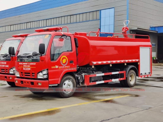 ISUZU 4×2 fire water bowser, ISUZU NKR Left Hand Drive model 4x2 chasis, MSB 5-speed manual gearbox, ISUZU 130HP diesel engine, lukisan dan logo bergantung pada keperluan.