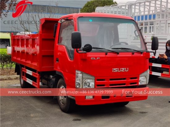 Trak buang pemacu ISUZU 4x2, casis trak 4 roda kabin ISUZU ELF Asal, kotak gear manual MSB 5-anjakan, enjin diesel ISUZU 130HP, badan tipper keluli kekuatan tinggi, dengan HYVA atau pengangkat hidraulik domestik pilihan. Semua lukisan dan logo bergantung pada keperluan pelanggan.
