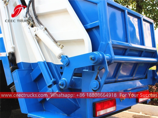 Trak termampat sampah belakang ISUZU 5cbm, casis trak menggunakan enjin diesel ISUZU 130HP, gear transmisi 5-anjakan MSB. Kotak kawalan PLC untuk operasi mudah. Semua lukisan dan logo berdasarkan keperluan pelanggan.
