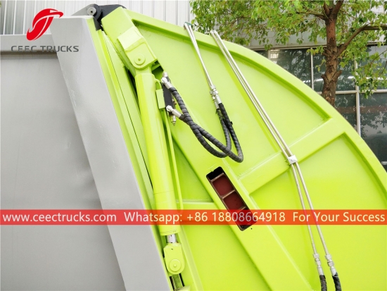 ISUZU 4m3trak pengutip sampah beban belakang, casis trak menggunakan enjin diesel ISUZU 98HP, gear transmisi 5-anjakan MSB. Kotak kawalan PLC untuk operasi mudah. Semua lukisan dan logo berdasarkan keperluan pelanggan.