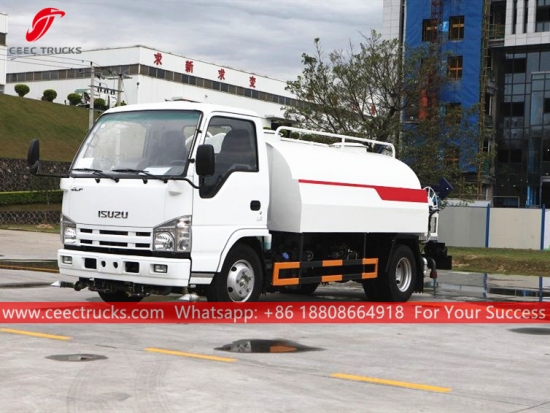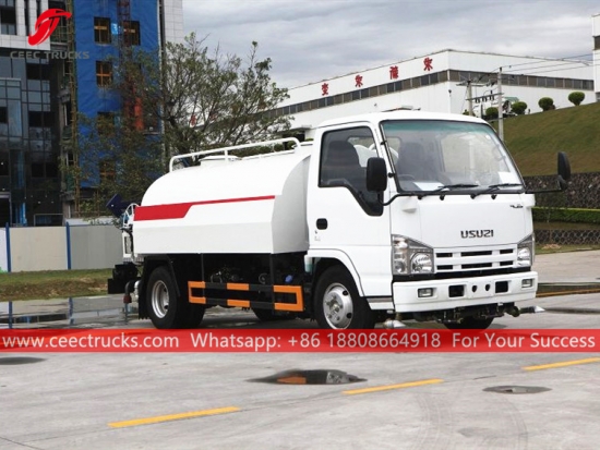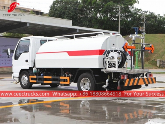 Trak bowser air ISUZU 4,000L, casis pemacu tangan kiri ISUZU 4*2, kotak gear manual MSB 5-anjakan, enjin diesel ISUZU 98HP, pam air jenama terkenal, dengan muncung penyembur depan, tengah dan belakang pilihan. Semua lukisan dan logo bergantung pada keperluan.