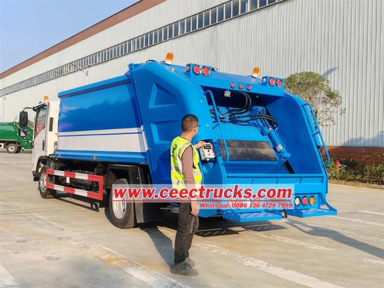Trak pemadat pemuat belakang Isuzu 700P CEEC diubah suai pada casis pemacu 4*2, jarak roda 4175mm, dilengkapi dengan enjin 4HK1-TCG61, 190 kuasa kuda, anjakan 5193ml, reka bentuk intercooler pengecas turbo sebaris 4 silinder, kotak gear MLD 1.5-kelajuan maksimum 1.5km Tong sampah mempunyai kapasiti 10 meter padu dan diperbuat daripada plat keluli kamiran berbentuk arka. Panel bawah dan sisi adalah keluli khas Q235 setebal 4mm, dan nisbah mampatan mencapai 1:3.4. Sistem pemunggahan dan pemunggahan sampah menggunakan kawalan automatik PLC.