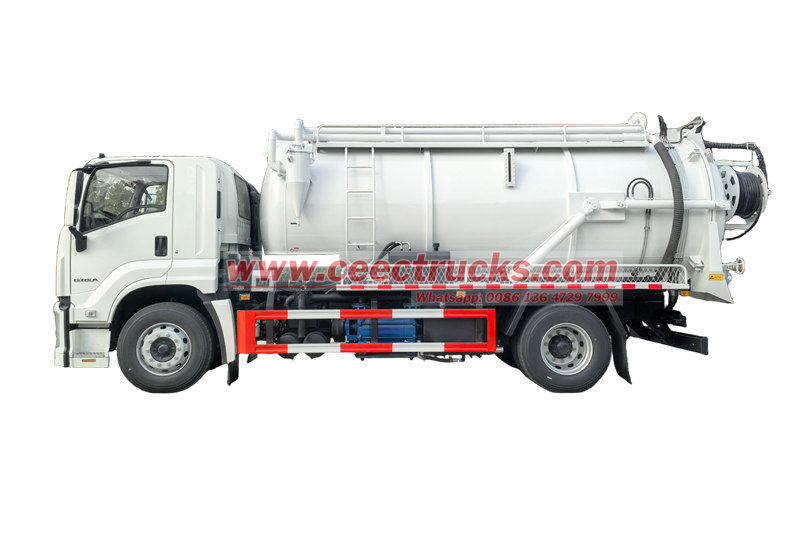 Trak jetter vakum gabungan Isuzu GIGA (juga dikenali sebagai trak pembersih vakum, trak pembersihan kumbahan, trak vakum kumbahan, trak vakum penyedut selokan 10,000 liter, dll.) digunakan untuk mengumpul, mengangkut dan membuang cecair seperti air kotor, enap cemar, septik, minyak batu mentah dan bahan pepejal seperti batu bata kecil.