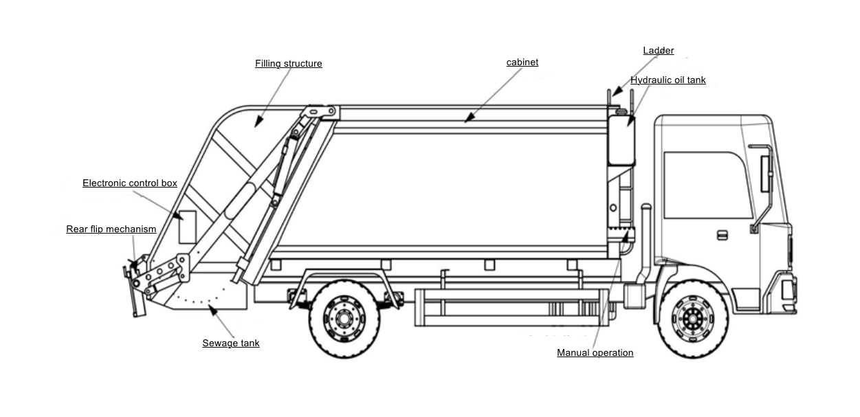 Struktur atas mempunyai tangki sisa termampat keluli karbon 10 meter padu dengan ketebalan sisi 4mm dan ketebalan bawah 5mm, yang tahan lama dan mempunyai kapasiti yang besar. Badan pemadat melengkung dilengkapi dengan silinder hidraulik Hefei Wanye jenama Cina berkualiti tinggi untuk memastikan mampatan yang berkuasa dan boleh dipercayai.
