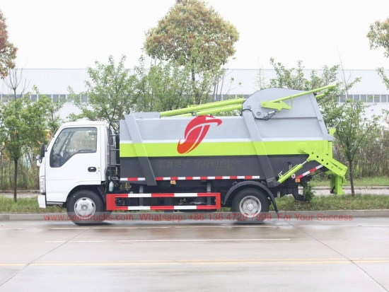 Trak pemampat sampah ISUZU 7cbm tidak bocor, casis trak menggunakan enjin diesel ISUZU 98HP, gear transmisi MSB 5-shift. Badan pemadat menggunakan struktur berbentuk bot dan sistem kawalan CAN untuk operasi yang mudah. Semua lukisan dan logo berdasarkan keperluan pelanggan.