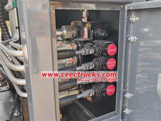 Kotak kawalan elektrik pintu belakang:Kotak kawalan elektrik yang terletak pada pintu belakang kenderaan menyediakan kaedah kawalan lain untuk kakitangan darat. Ia boleh mengendalikan slaid pengikis, mengawal kerja mampatan kitaran, atau berhenti kecemasan, dsb.
