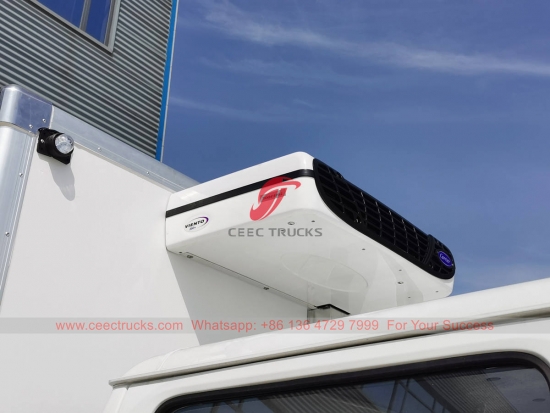 Van sejuk beku 2 tan ISUZU, model pacuan kiri ISUZU 4×2 casis dengan kabin berkembar, kotak gear manual MSB 5-anjakan, enjin ISUZU 98HP. Dilengkapi dengan unit penyejukan America Carrier untuk prestasi tinggi, manakala kapasiti van boleh menjadi pilihan 2-25T.