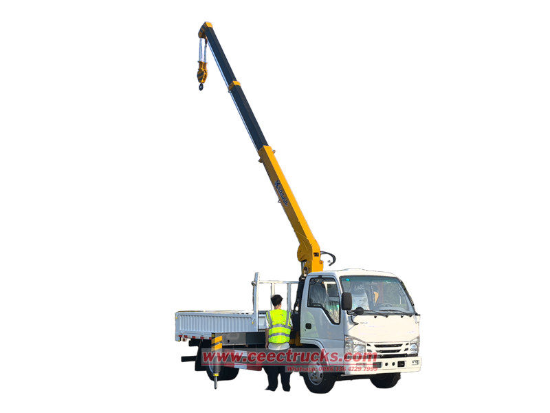 Kren boleh Untuk pemilihan, anda boleh memilih lengan lurus atau kren lengan lipat. Kren yang dipasang pada lori Isuzu terdiri daripada boom, meja putar, rangka, kaki dan bahagian lain.