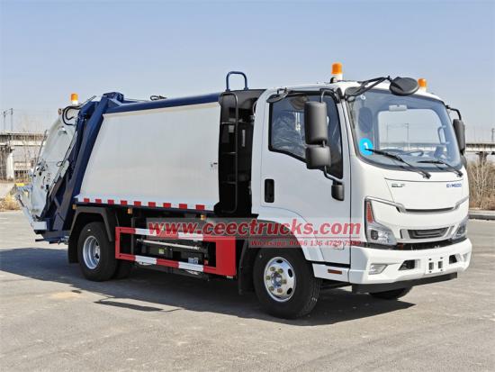 ISUZU electric new energy refuse compactor truck is designed based on EVM600 series truck chassis, mounted with 6000Liters garbage compactor body, based on internaional T420 material, thickness for side 4mm and floor 4mm, rear loading type and suitable for 240L and 1100L international standard garbage bins, integrated CAN BUS electric control box in cabin and rear hopper, which efficiently for working and convenient for usage. Painting and Logos 100% customized to meet all customer requirement.