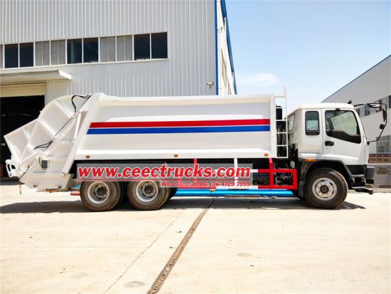 The Trak sampah pemampat 16cbm tugas berat Isuzu ialah kenderaan sanitasi bandar dengan prestasi cemerlang. Ia menggunakan teksi klasik Isuzu dengan2 tempat duduk dan 1 tempat tidur, serta dilengkapi dengan radio antara muka USB dan penghawa dingin untuk memberikan pemandu persekitaran pemanduan yang selesa. Thelori boleh mencapai kelajuan maksimum 95km/j. Dari segi kuasa, yanglori dilengkapi dengan enjin Isuzu 6HK1-TCH dengan sesaran 7790ml dan kuasa kuda sehingga 300HP. Trak pemadat sampah Isuzu FVZ bdalam mempunyai isipadu 16 meter padu, ketebalan panel sisi 4mm, dan ketebalan panel bawah 5mm. Ia diperbuat daripada keluli karbon dan keluli berkekuatan tinggi. Sampah bdalam diperbuat daripada keluli berkekuatan tinggi 4mm T420 dan telah dirawat dengan rawatan anti-karat di dalam dan luar. Tong sampah belakang mempunyai kapasiti 1.8-2.2 meter padu dan dilengkapi dengan tangki kumbahan 200+200 liter. Kotak sampah mempunyai reka bentuk arka standard.