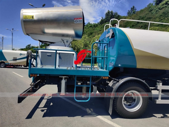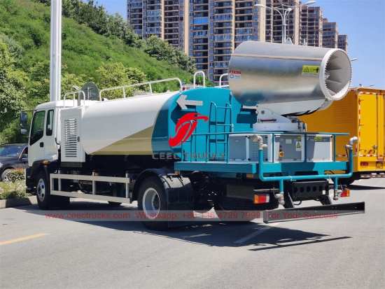 Trak penindasan habuk ISUZU FTR 10,000L, casis pemacu tangan kiri ISUZU FTR, kotak gear manual 6-anjakan MLD, enjin diesel ISUZU 205HP, pam air jenama terkenal dan meriam kabus, dengan muncung penyembur depan, tengah dan belakang pilihan. Semua lukisan dan logo bergantung pada keperluan.