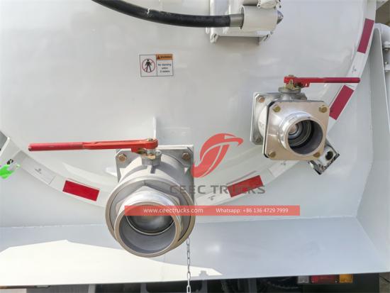 Dilengkapi dengan tingkap Periksa, injap pelepasan, radas pembersih, paip sedutan panjang 5 meter, pemisah air minyak, injap limpahan, dsb. Tangki vakum silinder boleh diangkat secara hidraulik ke 40-45 darjah. Pintu belakang boleh dibuka dan ditutup secara hidraulik. |