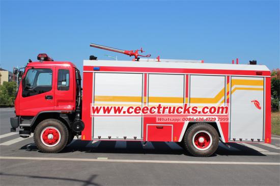 The Tangki air Isuzu FVR dan trak bomba serbuk kering mempunyai prestasi pelbagai fungsi, dengan jumlah berat badan 18,000 kg, sistem pemanduan 4x2 dan 6HK1-TCG61 enjin diesel dengan kuasa 221 kilowatt dan kelajuan maksimum 90 km/j. Kenderaan itu dilengkapi dengan tangki air 4 meter padu dan2000L tangki serbuk kering, serta pam api CB10/40 dengan tekanan kerja 1~4 MPa dan kadar alir 40 liter/saat. Selain itu, kenderaan itu turut dilengkapi meriam air PS 40wjulat kerja sehingga 55 meter, dan sudut operasi dari -30° hingga 80°, memenuhi keperluan memadam kebakaran yang berbeza. Pada masa yang sama, trak itu juga boleh dilengkapi dengan tangki bahan yang berbeza, yang boleh dibahagikan kepada beberapa petak mengikut keperluan, dan boleh dilengkapi dengan pam daripada pelbagai jenama terkenal, yang mempunyai fleksibiliti dan kebolehgunaan yang tinggi.