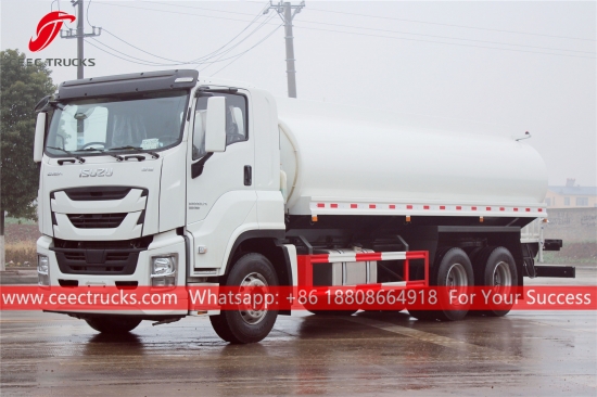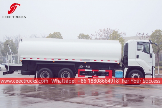 Trak bowser air ISUZU 20,000L, casis pemacu tangan kiri ISUZU GIGA, kotak gear manual ZF 16-anjakan, enjin diesel ISUZU 380HP, pam air jenama terkenal, dengan muncung penyembur depan, tengah dan belakang pilihan. Semua lukisan dan logo bergantung pada keperluan.