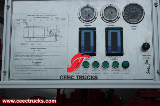 Pelbagai instrumen dan penunjuk dipaparkan dengan jelas pada panel, termasuk tolok vakum untuk memantau tekanan sedutan sistem dan tolok tekanan untuk menunjukkan tahap tekanan dalam tangki air dan tangki buih. Instrumen ini penting untuk memastikan sistem trak bomba beroperasi dalam julat optimum, membolehkan pengendali membuat pelarasan mengikut keperluan.