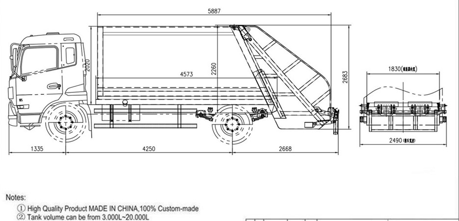 Penampilan tersuai 100%, reka bentuk kapasiti tong pemadat, kaedah operasi dan lokasi, juga saiz trak keseluruhan boleh disesuaikan .