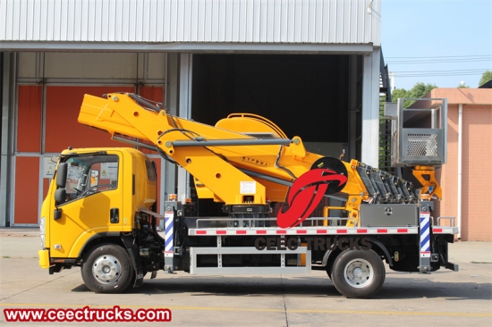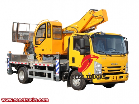 Trak angkat kren baldi 16m, casis ISUZU KV100 4x2, kotak gear manual 5-anjakan, enjin diesel ISUZU 120HP, pengecatan dan logo bergantung pada keperluan. Kotak kawalan bahasa pelanggan.