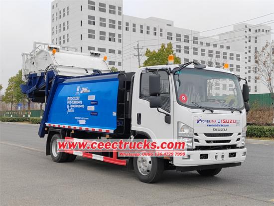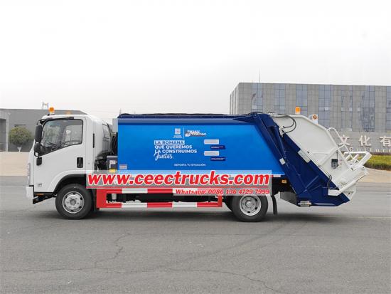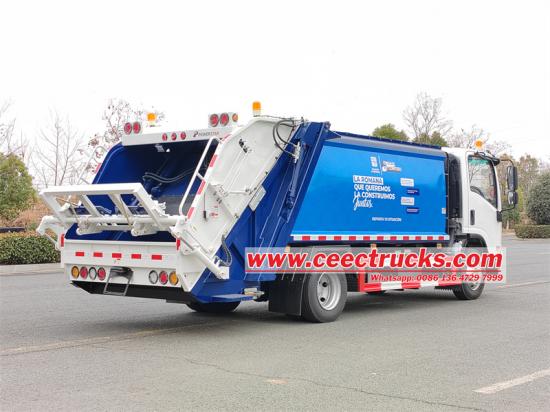 Trak pemadat sampah Isuzu 700P 8 padu, diubah suai berdasarkan casis Isuzu 700P, jarak roda 3815mm, enjin Isuzu 4HK1-TCG61, 139Kw, pelepasan Euro 6, sesaran 5193ml. Isipadu mampatan kenderaan ialah 8cbm, diperbuat daripada keluli karbon. Pemunggahan sampah kenderaan mempunyai empat kawalan operasi, termasuk kotak kawalan elektrik di dalam teksi, tuil operasi hidraulik manual di sebelah pemandu, kotak kawalan elektrik di sebelah kiri pintu belakang, dan tuil operasi manual di sebelah kanan pintu belakang, yang meningkatkan kecekapan kerja.