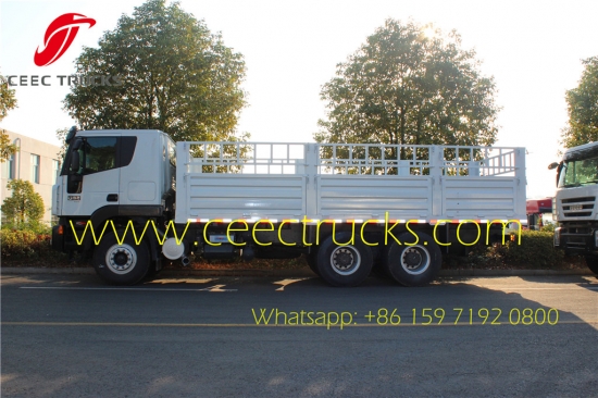 Trak kargo IVECO 6*4 menggunakan casis iveco asli, enjin Crusor C9 340 HP, kotak kargo bahan keluli karbon berkualiti tinggi Q345, kekuatan super. eksport kenya mombasa