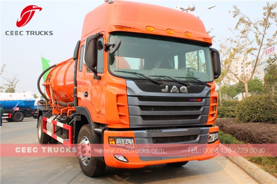 Pengosong cesspit jenama JAC 10000L, enjin diesel JAC 180HP, kotak gear manual 8 anjakan, kapal tangki sedut vakum keluli karbon dengan kapasiti 10 cbm, pam vakum WEILONG jenama China yang terkenal, alat angkat hidraulik untuk pelepasan sisa, mengecat dan logo bergantung pada permintaan.