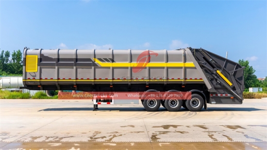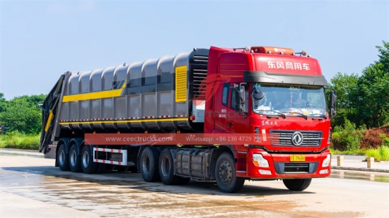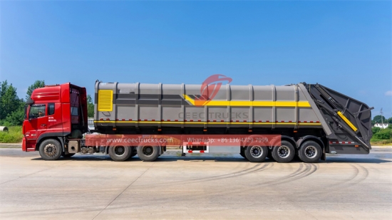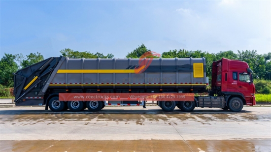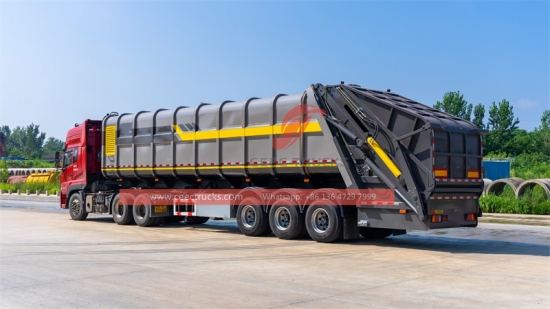 Beban Belakang 45CBM treler separuh pemadat sampah (juga dipanggil pemampatan sampahsemitrailer, pemadat sisasemitrailer, sampah sarap baliktreler, pemadat sampahsemitrailer,pemuat belakangsemitrailer, treler sampah) ialah sejenis treler yang digunakan untuk mengumpul, memadatkan dan mengangkut bahan sisa pepejal.Separa treler pemadat sampah ialah alat penting dalam sistem pengurusan sisa, membolehkan pengumpulan, pemadatan dan pengangkutan bahan sisa pepejal yang cekap. Separa treler pemadat sampah berkapasiti besar 45CBM boleh mengurangkan jumlah sisa dan mengoptimumkan pengangkutan, ia menyumbang kepada persekitaran yang lebih bersih dan lebih mampan.