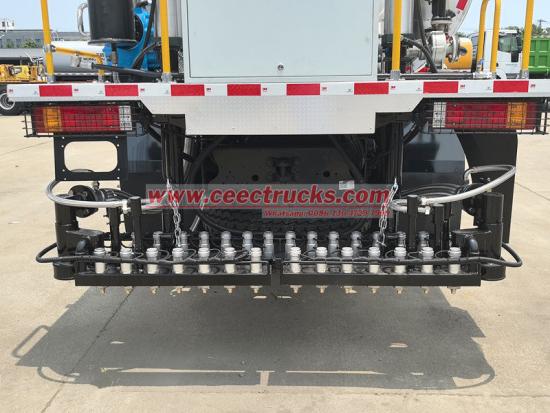Bahagian belakang trak tangki pengedar bitumen Shacman X3000 dilengkapi dengan rod penyembur boleh ditarik balik dengan lebar boleh laras, yang dilengkapi dengan beberapa set muncung kawalan aliran ketepatan tinggi. Ia boleh melaraskan volum dan liputan penyemburan dengan tepat mengikut keperluan pembinaan (seperti lapisan telap, lapisan pelekat, dan lapisan pengedap), dan mencapai penyemburan berubah-ubah jarak luas 0.2-3L/㎡.