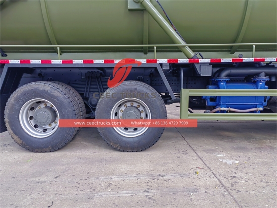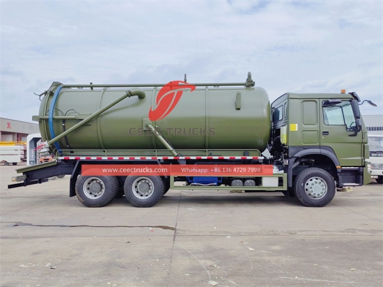 HOWO 6×4 Trak Tangki Vakum (juga dipanggil trak kumbahan vakum, penyedut pembetung, trak kumbahan HOWO, pengosong parit, trak tangki septik, pengosong septik) digunakan untuk mengumpul, mengangkut dan mengeluarkan cecair seperti air kotor, enap cemar, septik, minyak mentah, dan bahan pepejal seperti batu kecil, batu bata juga. Ia sesuai untuk membersihkan pembetung, cesspit, cesspool, gully, dll. Ia digunakan secara meluas dalam persekitaran dan bidang sanitasi.