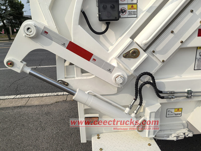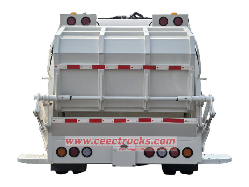 ● Tong sampah dan pemuat trak sampah pemuat belakang HOWO kedua-duanya diperbuat daripada struktur dikimpal plat keluli karbon berkualiti tinggi, dan tong sampah menggunakan keratan rentas berbentuk arka. Tong sampah dilengkapi dengan penyodok lipat, yang digerakkan oleh silinder penyodok dan boleh meluncur di sepanjang rel panduan di kedua-dua belah bahagian bawah tong sampah. Sudut bukan sahaja berfungsi untuk memunggah sampah, tetapi juga berfungsi untuk menutup bahagian hadapan tong sampah.