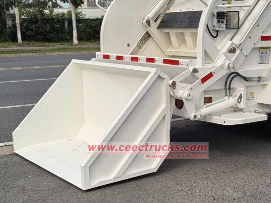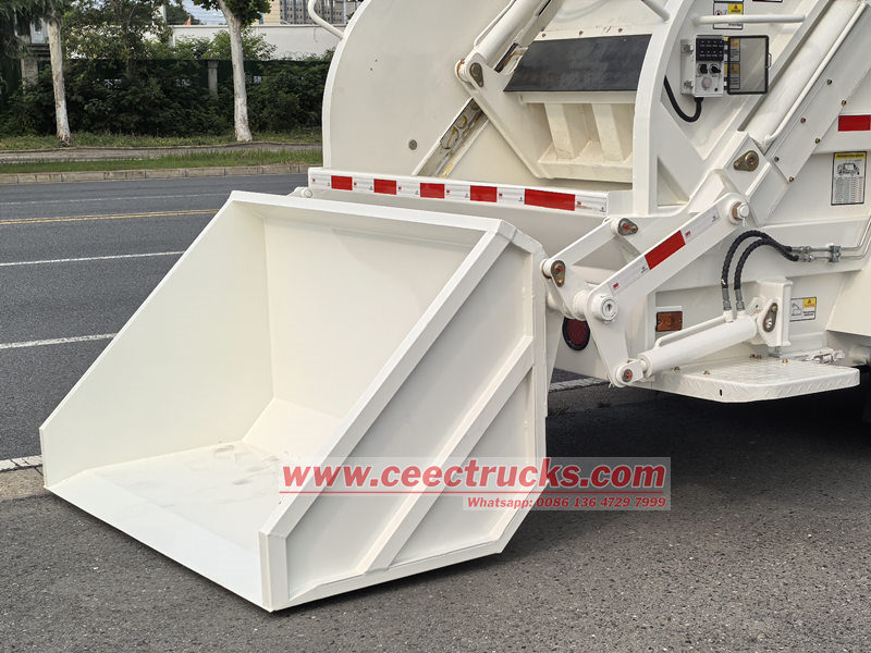 ● Pemuat mempunyai plat slaid dan pengikis, yang masing-masing digerakkan oleh silinder plat slaid dan silinder pengikis. Plat gelongsor bergerak dalam alur gelongsor pada kedua-dua belah pemuat, dan pengikis bergerak di sekeliling engsel plat gelongsor. Silinder pengangkat dan mekanisme penguncian dipasang di antara tong sampah dan pemuat. Silinder pengangkat memacu pemuat naik dan turun, dan mekanisme penguncian mengunci pemuat pada tong sampah.