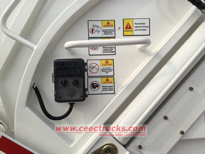 Kotak kawalan operasi dipasang di dalam teksi dan di belakang kenderaan. Kotak kawalan operasi dalam teksi boleh mengawal menolak dan memunggah dan memilih mod operasi (seperti automatik atau manual), dan kotak kawalan operasi di bahagian belakang kenderaan mengawal operasi mekanisme menekan dan mengisi dan mekanisme pusing tong. Ia sangat mudah digunakan dan dikendalikan. Terutama di tapak pelupusan, pengendali boleh menyelesaikan pemunggahan dan pembuangan kumbahan tanpa turun dari kenderaan. Peranti kawalan jauh berwayar boleh dipasang mengikut keperluan pengguna.
